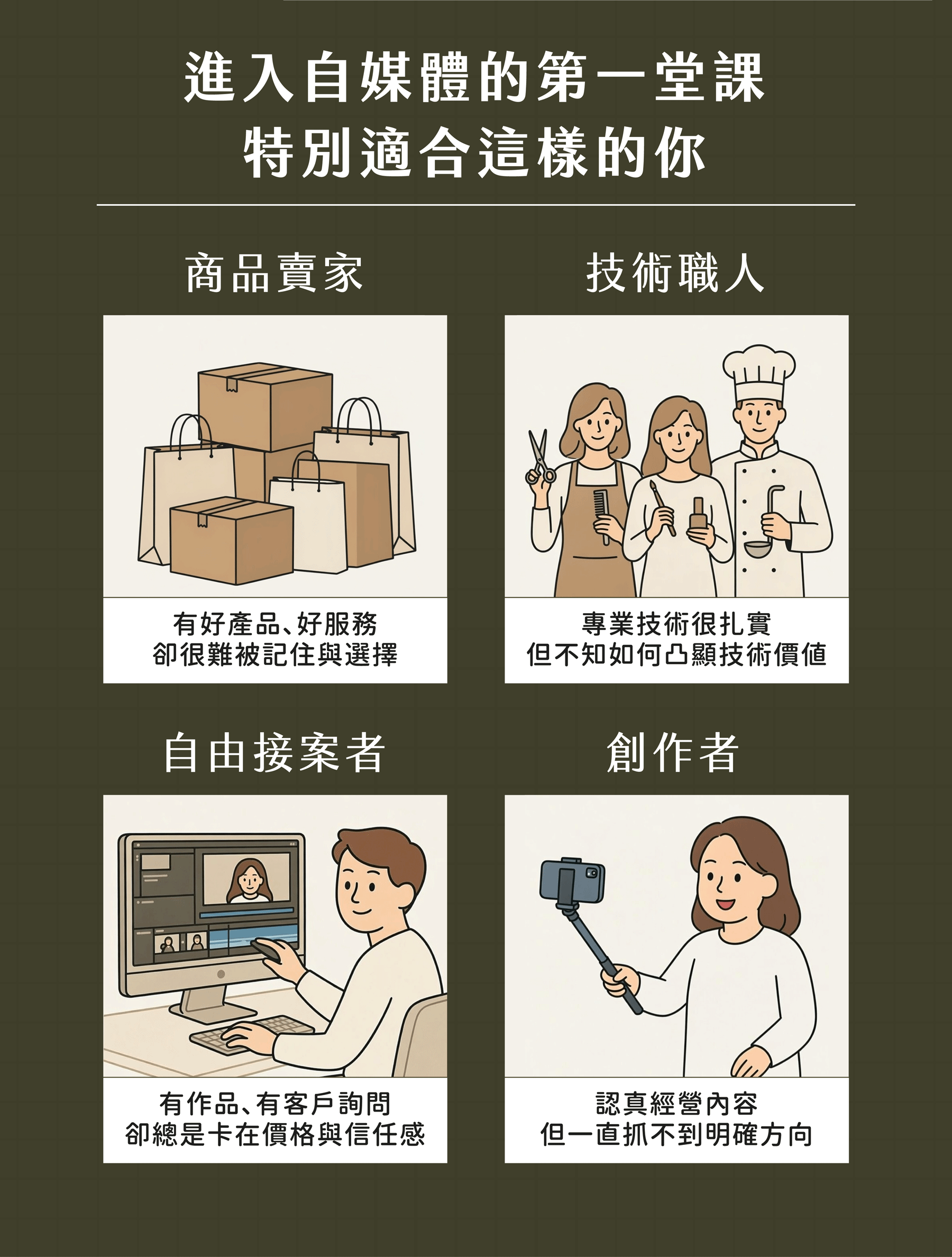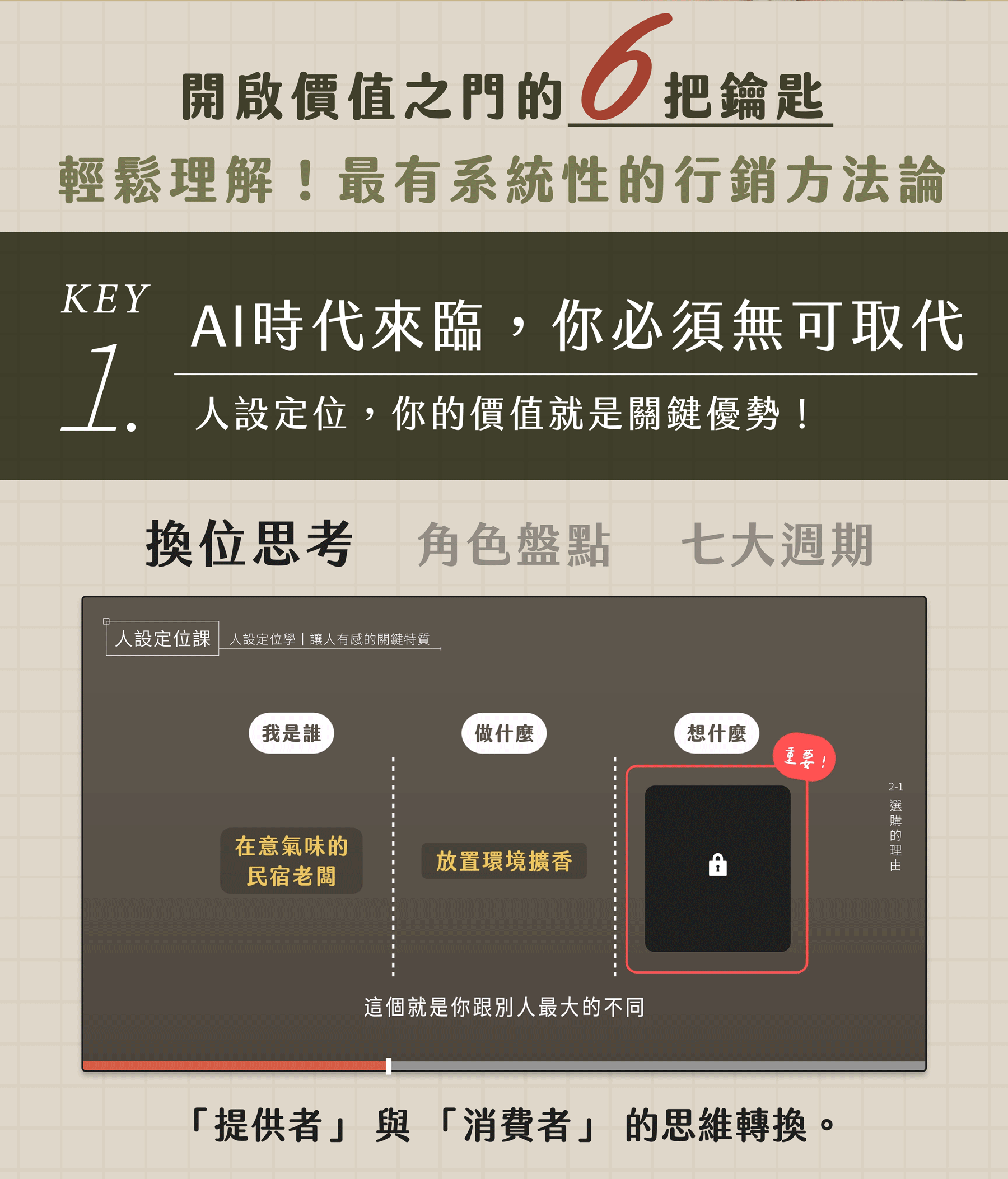 這堂課特別把艱深又枯燥的行銷概念,透過有趣的拆解與案例,讓你簡單好上手。全程避免太專業的術語,降低學習隔閡,整堂課的資訊量雖然不低,甚至可以說非常豐富!但運用動畫設計,讓你不需要有行銷基礎就能輕鬆理解,如果你剛好有行銷經驗,那就太棒了!這堂課會讓你更透徹,上完後也許你能利用所學幫助到身邊的人~