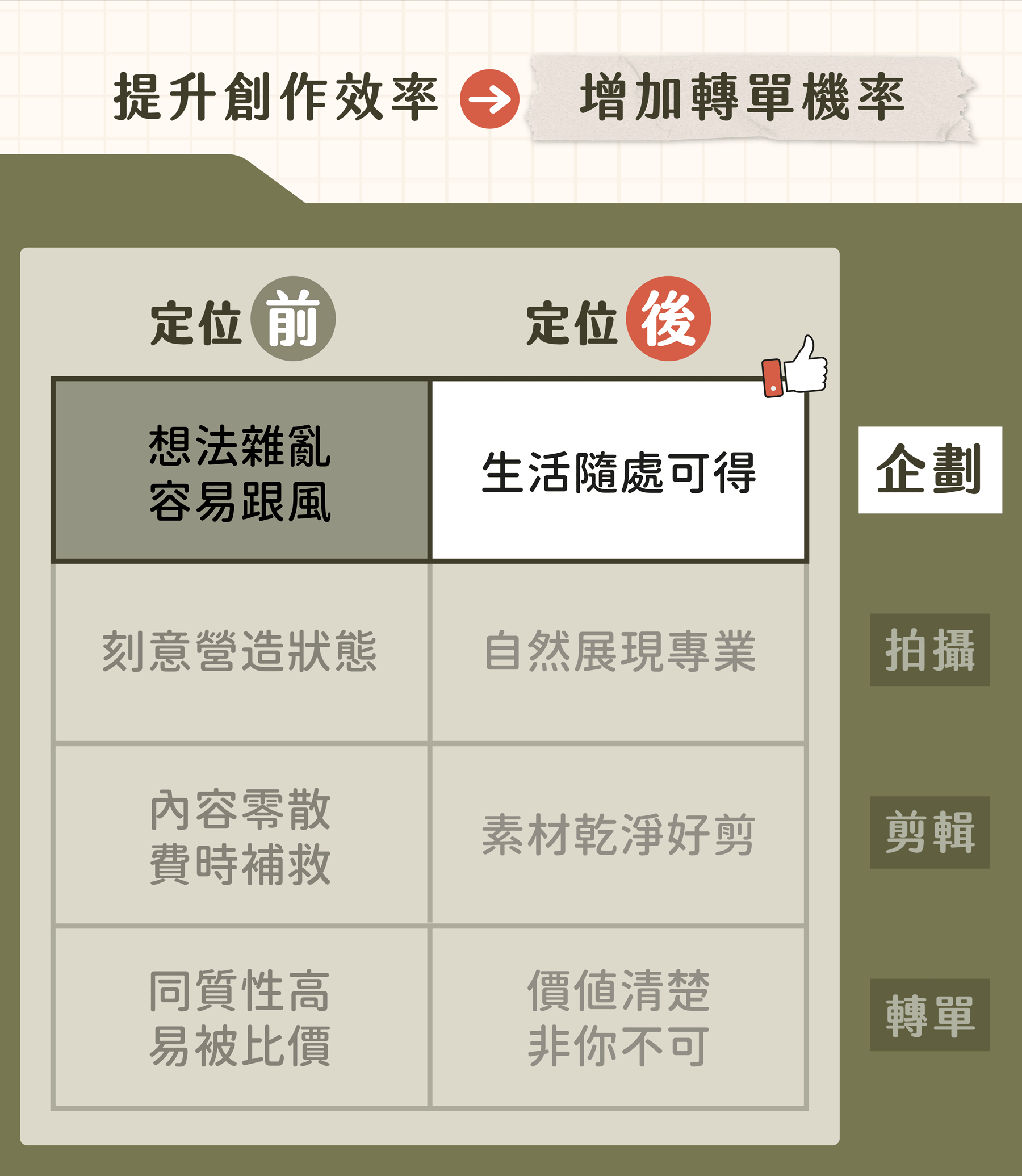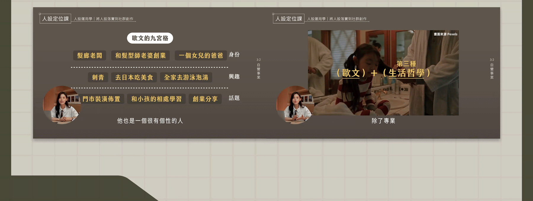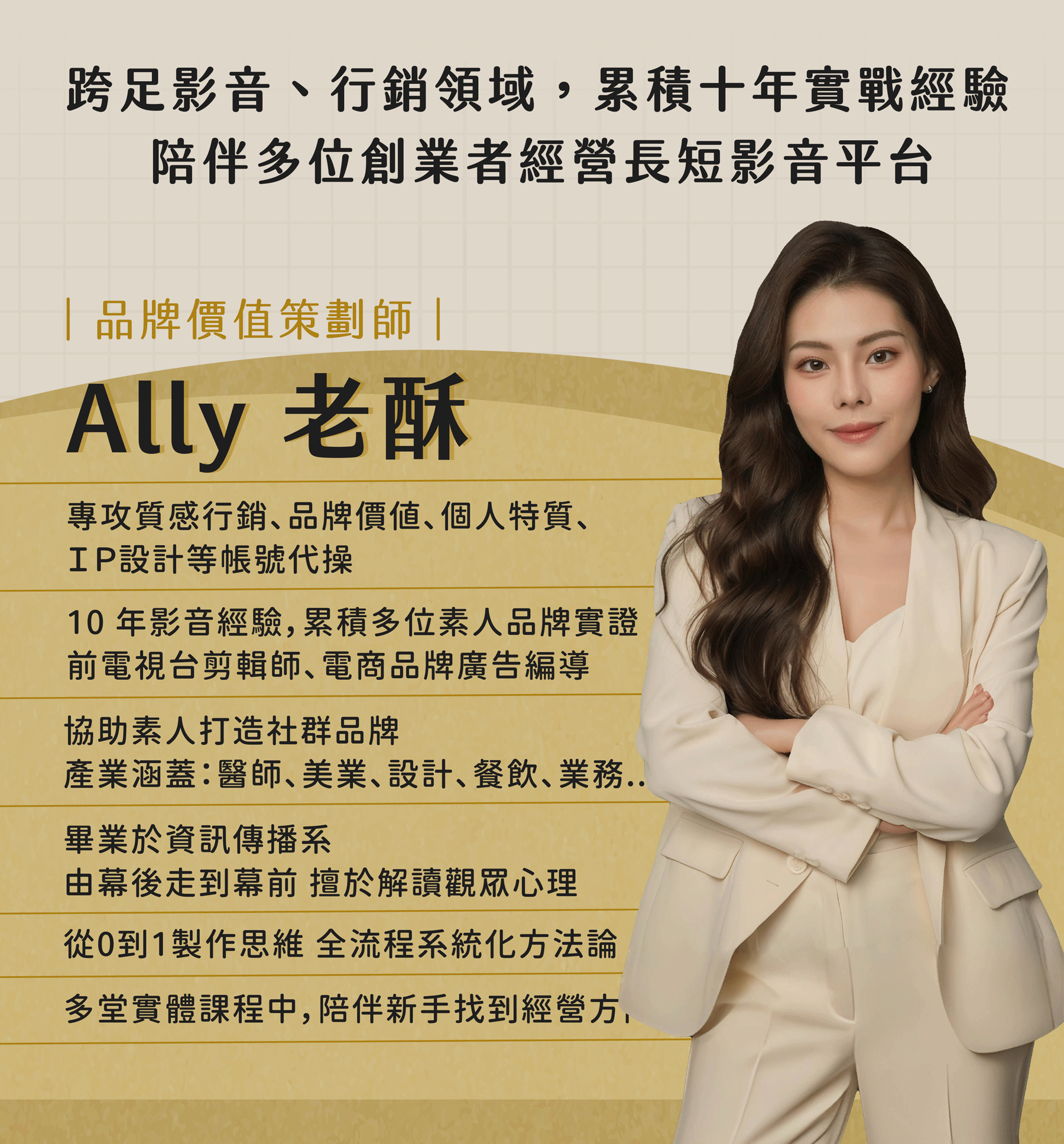 ✦ 擁有 10 年影音製作經驗 ✦ ➜ 畢業於資訊傳播學系 ➜ 曾任電視台剪輯師、電商品牌廣告編導 運用邏輯以及換位思考的強項 從抽象中,做出有共鳴有溫度的故事 透過提升自我價值、放大信念 陪伴上百位客戶建立差異化行銷 成功在產業裡脫穎而出!